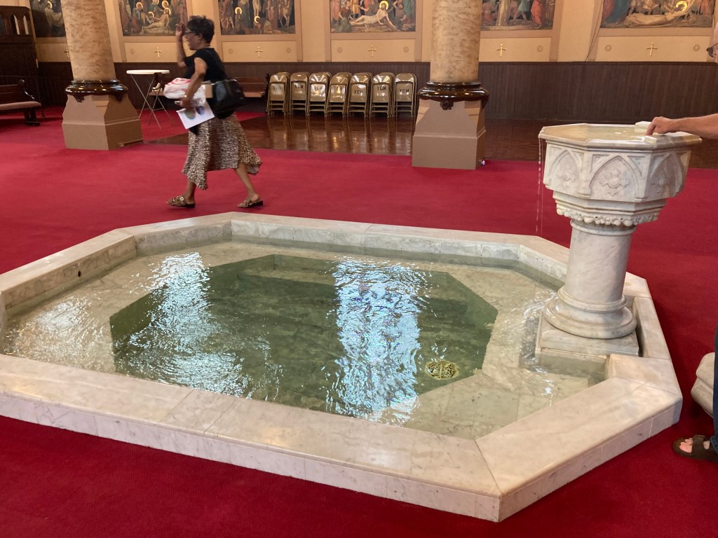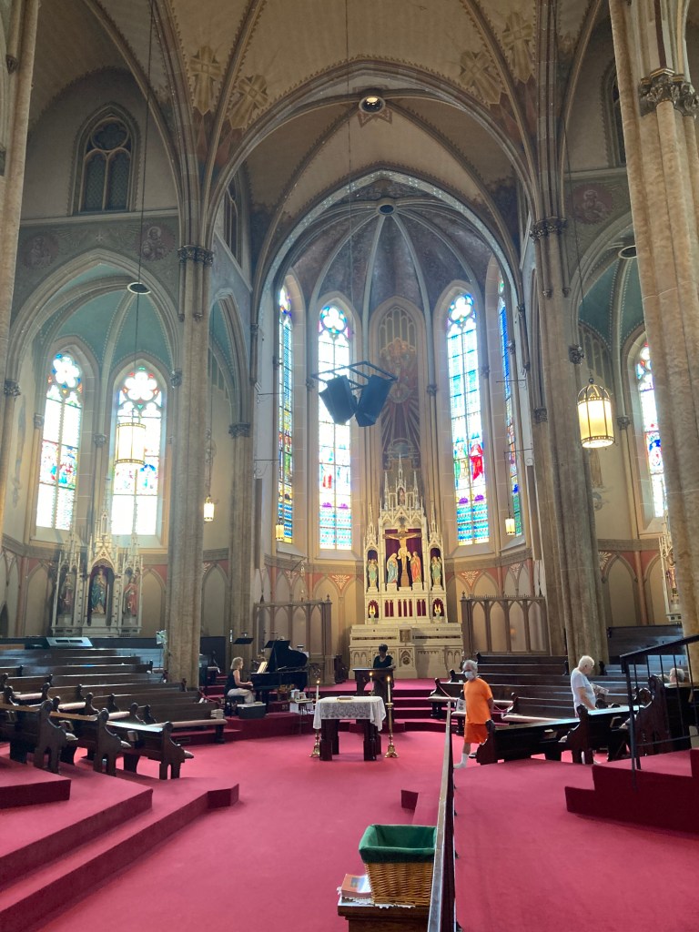 The church itself has also undergone a transformation. Its rolls have dwindled as the neighborhood changed. Rather than continue to use the space as designed, with a few dozen parishioners spread into a church made for a thousand, they tore out the original pews and created an intimate area with the altar at the center of an elevated in-the-round setting. It was a configuration that led to an observation that wouldn’t have been possible in its old layout, though you’ll have to wait for the book for details on that.
