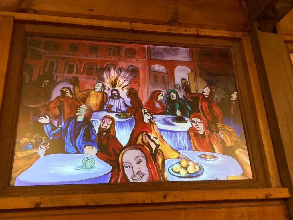 I’ve included a closing shot from the production as well as some of the spectacular artwork that adorns the church, courtesy of famed French artist Andre Girard and, later, his student, Josephine Belloso. The latter is retired teacher who I had the immense privilege of interviewing.