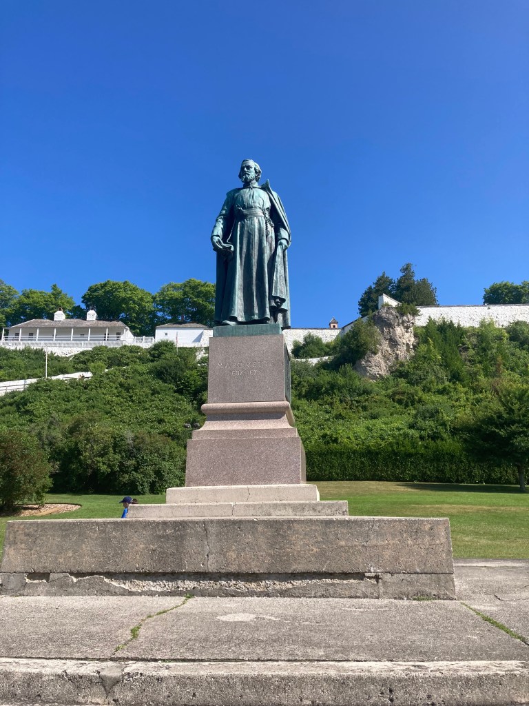 Mackinac, like so many other outposts west of the east, was initially explored by the Jesuits and their Native friends. Specifically, Father Jacques Marquette and Louis Joliet and the Huron Tribe. In fact, Father Marquette’s outsized role in the island’s history is preserved in bronze, just below Fort Mackinac.