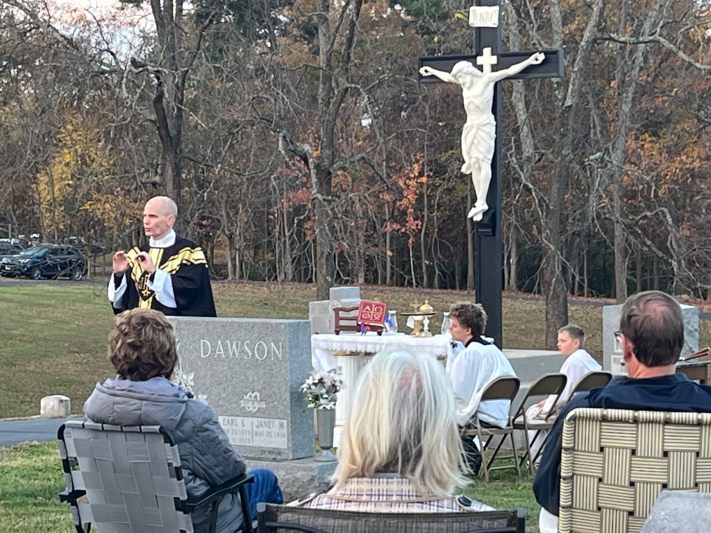 This morning brought me to Dover, Indiana and St. John, the second-oldest parish in the state. But Mass itself was outside, as the parish celebrated its All Souls Mass on the adjacent cemetery. It was a typically moving Mass, even if the wind and nearby speeding semi-trucks occasionally made it a challenge to hear all of Father John’s Hollowell’s words.